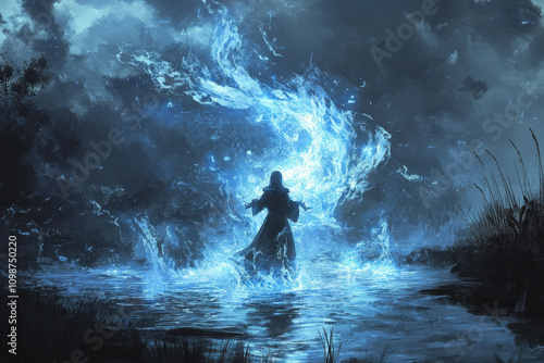 © Matija, Fototapeta premium Hooded Mage Summoning Blue Magic by a Misty Mountain Lake