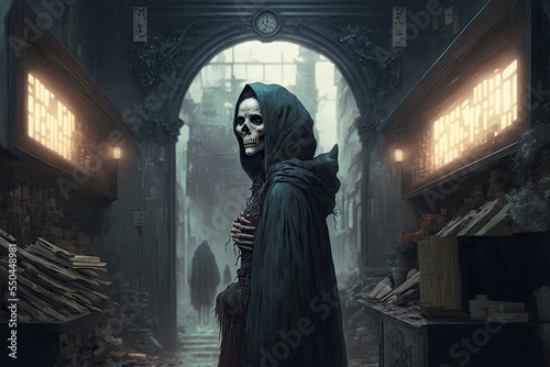 © DKN Media, Naklejka premium Hooded skeleton character in dark alley