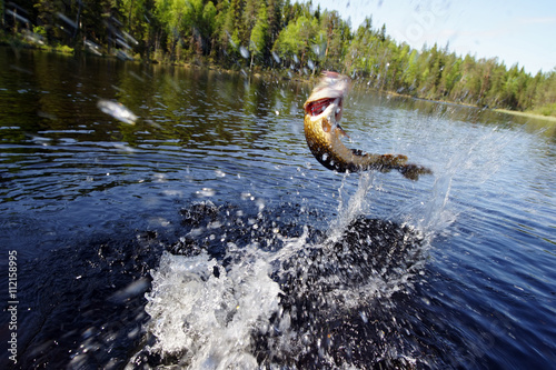 © mikhailg, Naklejka premium Hooked pike jumping out of water