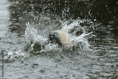 © Vitaly Zubrytsky, Obraz premium Hooked trout beats on a water with a lot of splashes