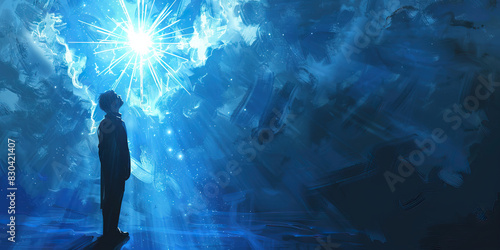 Fototapeta premium Hope (Light Blue): A figure looking up at a bright star, symbolizing hope and...