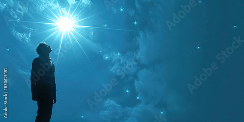 Fototapeta premium Hope (Light Blue): A figure looking up at a bright star, symbolizing hope and...
