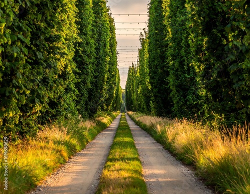 © Lilaacs, Obraz premium Hops farm pathway at sunset