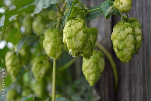 Obraz premium Hops Fruits Close Up, Old Wooden Wall In Background