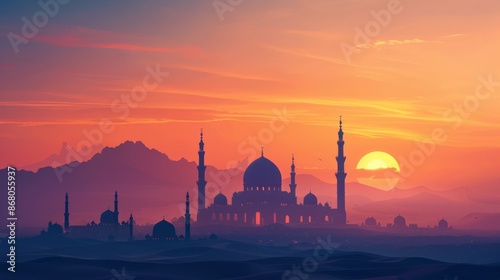 Fototapeta premium Horizon Line: banner background of Mosque Day theme banner design for microstock, no text, and wide copy space, Horizon Line: The mosque on the horizon with a simple landscape, for banner,
