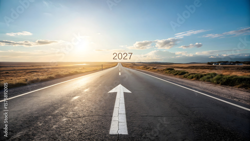 Fototapeta premium Horizon 2027 Road with Arrow Symbolizing Future Goals and Open Landscape...