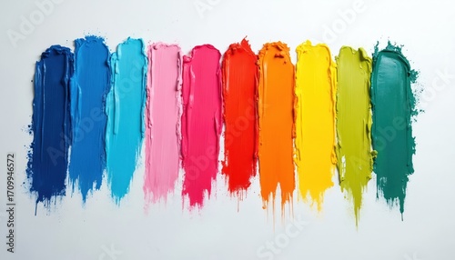 © Pete, Fototapeta premium Horizontal arrangement of colorful paint strokes on white canvas. Vivid blues, pinks, reds, oranges, yellows, greens showcase spectrum of hues. Thick texture, brush marks suggest creativity, artistic