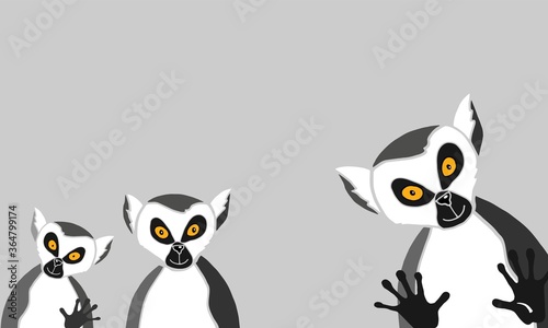 © GalaBush, Naklejka premium Horizontal background frame with lemurs for wallpaper decorative design. Animal character on gray background. Abstract modern template, vector illustration.
