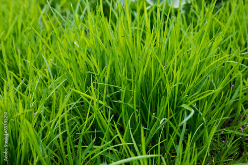 © tillottama, Fototapeta premium Horizontal background Fresh green grass closeup