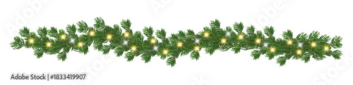 © Birol Dincer , Fototapeta premium Horizontal Christmas garland with pine cones, fir branches, holly berries, glowing lights, and balls. Perfect for holiday banners, cards, and transparent background