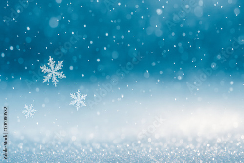 Fototapeta premium Horizontal close-up image of falling snowflakes set against a cool blue gradient background. The softly blurred flakes and bokeh lights create a dreamy, festive winter mood — ideal for holiday cards