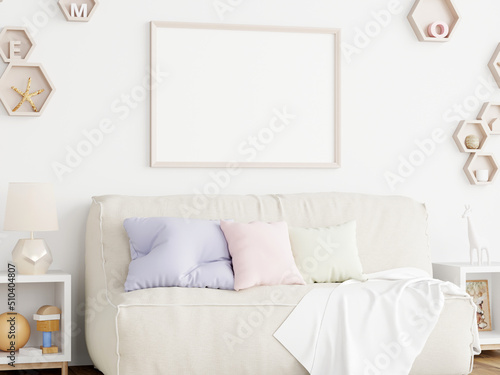 Naklejka premium horizontal frame mockup in modern kids room interior, 3d render