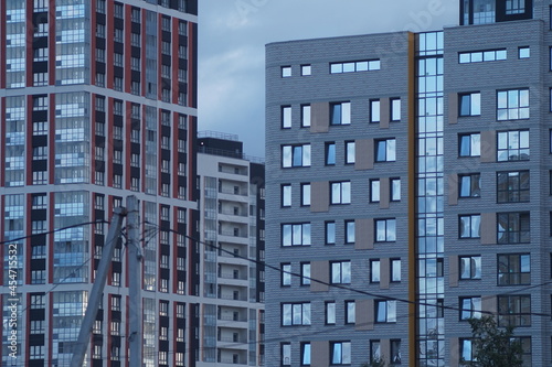 © Всеволод Коркунов, Fototapeta premium Horizontal full-color photo. Urban texture. Glass and concrete with reflections in the evening light.
