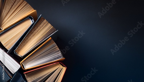 © Kerry, Fototapeta premium horizontal image of a top view of a stack of books dark background with copy space for text world book day concept for banner design cover thumbnail social media business linkedin presentat