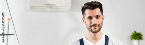 Fototapeta premium horizontal image of handsome, smiling repairman looking at camera near air conditioner on wall
