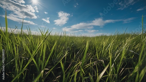 Obraz premium Horizontal landscape of green grass and clear blue sky with white cloud