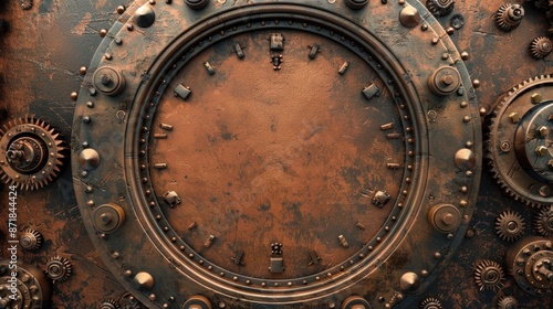 © The 2R Artificiality, Naklejka premium Horizontal metallic round frame banner with vintage and retro details for steampunk and mechanical design Mockup template with text space