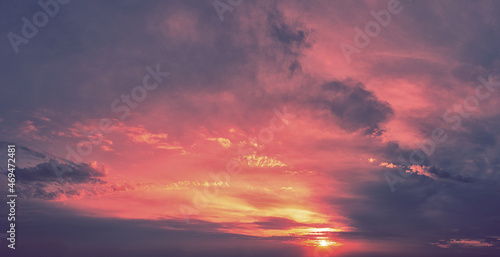 Fototapeta premium Horizontal panorama of a dramatic red black glowing cloudy sky at sunset. Sky...