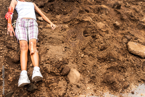 Fototapeta premium Horizontal photo of an unrecognizable young Latin woman victim of femicide lying on a pile of dirt