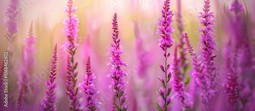 Fototapeta premium Horizontal purple loosestrife flowers categorized as Lythrum salicaria in the Lythraceae family are showcased in a copy space image