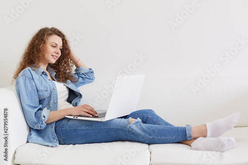 © sementsova321, Naklejka premium Horizontal shot of good looking curly haired young model sitting on white sofa, having laptop, watching videos, applying information, wearing jeans, white t shirt, socks and jacket. Tech concept.