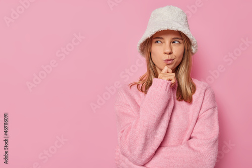© WHstudio Leushin N, Obraz premium Horizontal shot of lovely pensive woman holds chin purses lips and looks mysteriously away wears white stylish hat and casual loose jumper isolated over pink background with copy space on right