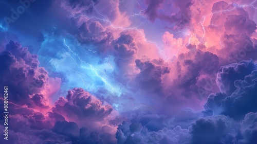 © ArtificialHorizons, Fototapeta premium Horizontal sky view showing clouds and lightning with pink and blue hues