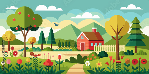 © VectorVibe, Fototapeta premium Horizontal spring landscape with fence, tulips, roses, blooming trees and bushes, hills, birds and house. Rural illustration with summer garden in cartoon flat style for banners, backgrounds, advertis
