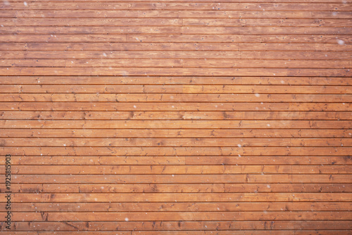 Fototapeta premium Horizontal wooden planks forming a rustic wall texture background with falling snow