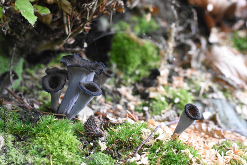 © Ivan, Obraz premium Horn of plenty mushrooms Craterellus cornucopioides in nature. The Black Trumpet fungi