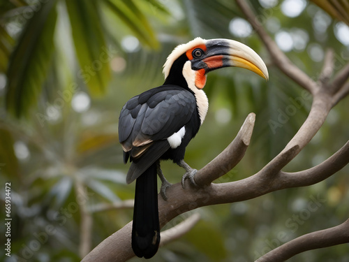 Naklejka premium Hornbills are a family of bird found in tropical and subtropical Africa, Asia and Melanesia. They are characterized by a long, down-curved bill which is frequently brightly coloured and sometimes has