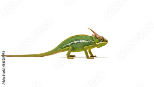 © AkuAku, Obraz premium Horned chameleon seen from the side as it moves across a white background, highlighting natural patterns