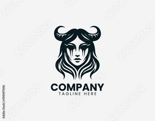 © Dawi Firdaus, Fototapeta premium Horned gothic woman portrait with flowing hair in dramatic modern black vector illustration