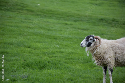 © dejavudesigns, Fototapeta premium Horned Ram Standing in a Grass Pasture