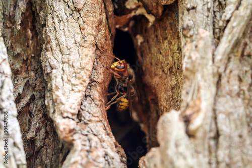 © boedefeld1969, Obraz premium Hornissen kommen aus ihrem Bau in einem hohlen Baumstamm