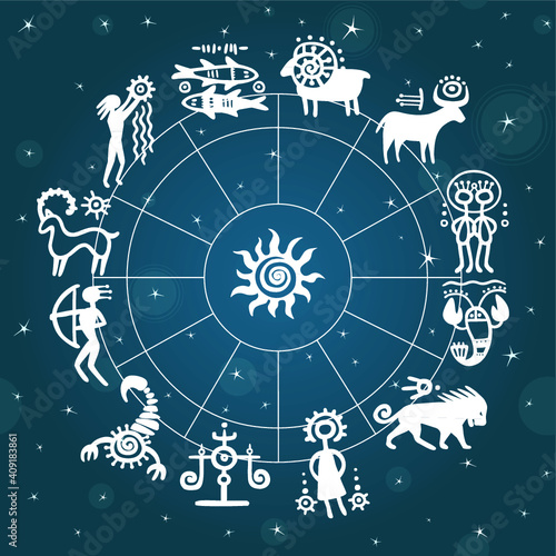 Obraz premium Horoscope circle against the stellar sky. Zodiac signs. Simulation of rock paintings.