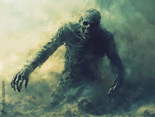 Fototapeta premium Horrifying Zombie Rising From the Mist Dark Fantasy Artwork