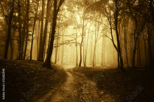 © andreiuc88, Fototapeta premium horror scene with a road through golden forest with dark trees