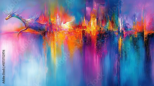 © Sonya, Naklejka premium Horse amidst cityscape with towering buildings & blue sky in background