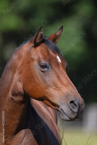 © Petr, Obraz premium horse, animal, brown, portrait, farm, head, mammal, equine, nature, stallion, mane, mare, pony, equestrian, beautiful, field, white, horses, grass, pasture, beauty, summer, eye, green, face