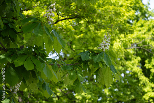 © Nataliia, Obraz premium Horse chestnut branches with young and mature blooms