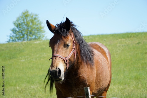 Fototapeta premium Horse - close-up on head, grass in background