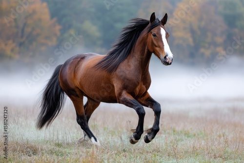 Fototapeta premium Horse galloping through misty meadow at dawn, showcasing natural beauty and grace