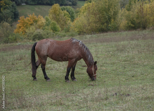 © Iryna, Fototapeta premium Horse grazing field on rural farm landscape