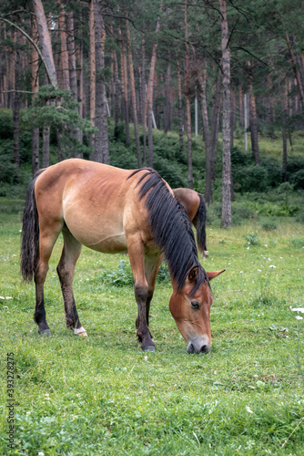 © Sergey, Fototapeta premium Horse grazing in a meadow near the forest