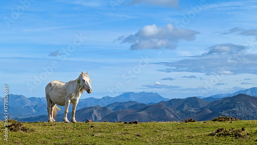 © IMAG3S, Naklejka premium Horse grazing in Sierra de Peñamayor, Nava, Comarca de la Sidra, Asturias, Spain
