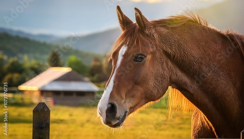 Naklejka premium horse head close up horse farm in the background rural landscape