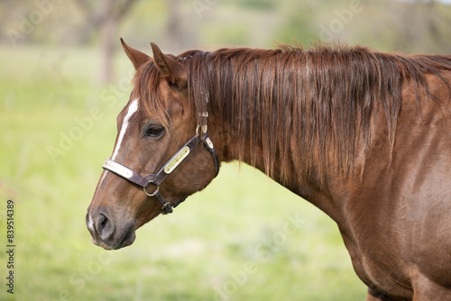 Fototapeta premium horse headshot portrait quarter horse in silver show halter Sorrel chestnut brown
