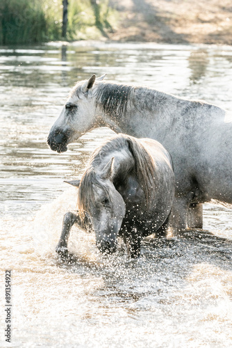 Fototapeta premium Horse horses having fun in water splash plashes pool lake paddock paradise