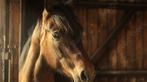 © Oldcorporal, Fototapeta premium Horse in Wooden Stable Looking Alert